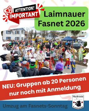 Liebe Freunde der Laimnauer-Dorffasnet, auch 2026 wird es wieder unseren kleinen aber legendären Umzug durch Laimnau mit anschließendem bunten Treiben rund um die Argentalhalle geben.