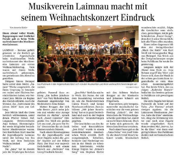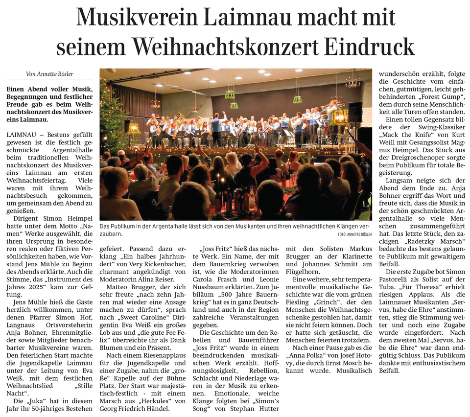 Im Anschluss nahm die Musikkapelle das Publikum mit auf eine abwechslungsreiche musikalische Reise. Historische Gedanken, persönliche Klangbilder und bekannte Melodien verbanden sich zu einem stimmungsvollen Jahresabschluss, der die Argentalhalle nahezu auf den letzten Platz füllte.